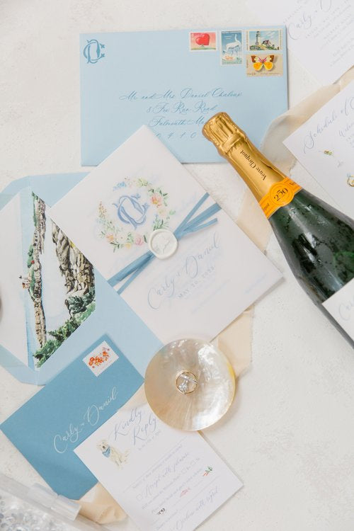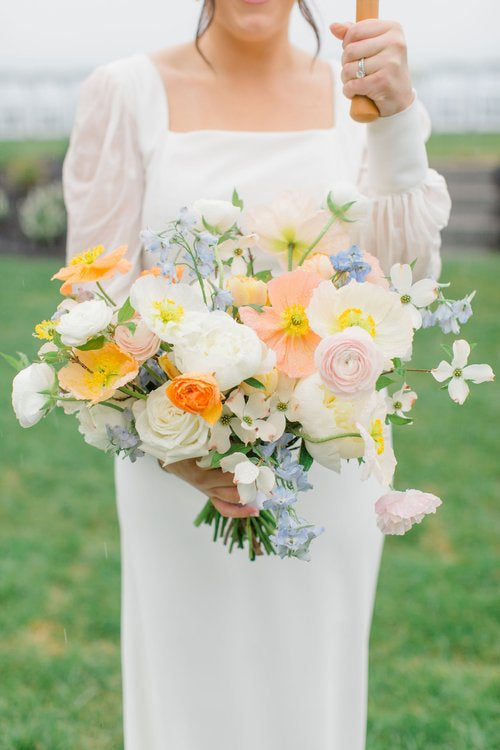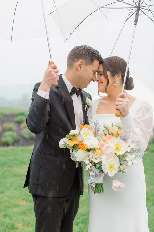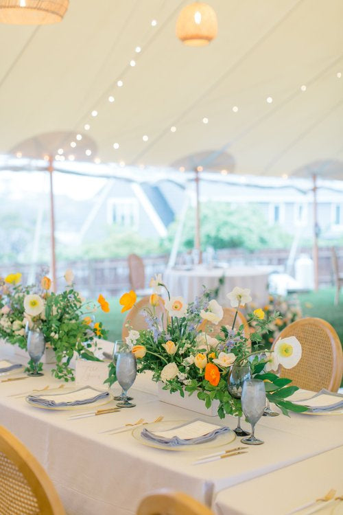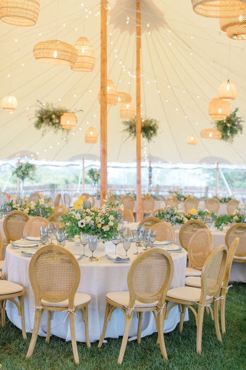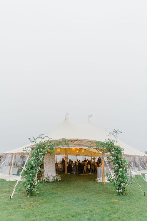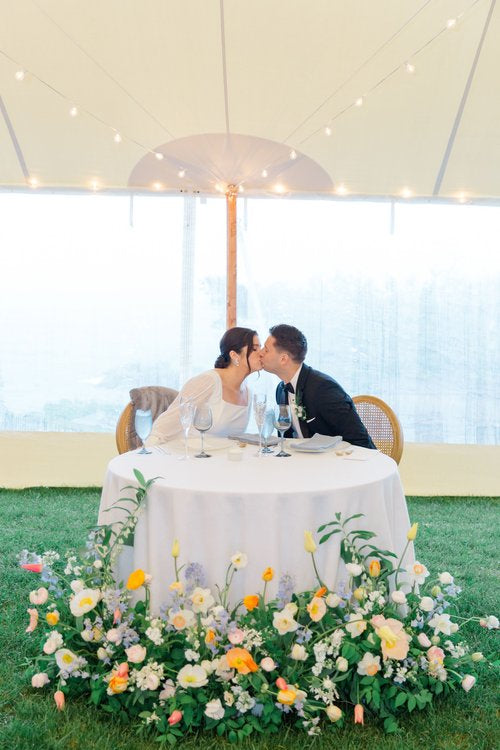 What an expertly designed wedding by Pinch Me Planning. I was especially into this palette (whites + creams with pops of pale blue, orange, yellow and pink), that tent entrance (hubba), and all the one-off floral clouds perfectly complimenting the hanging rattan tent elements. I’m also into any wedding in which every person, as witnessed here, has a great attitude about the weather- this is Maine and that’s the ocean, people! Look at those sweet newlyweds though…