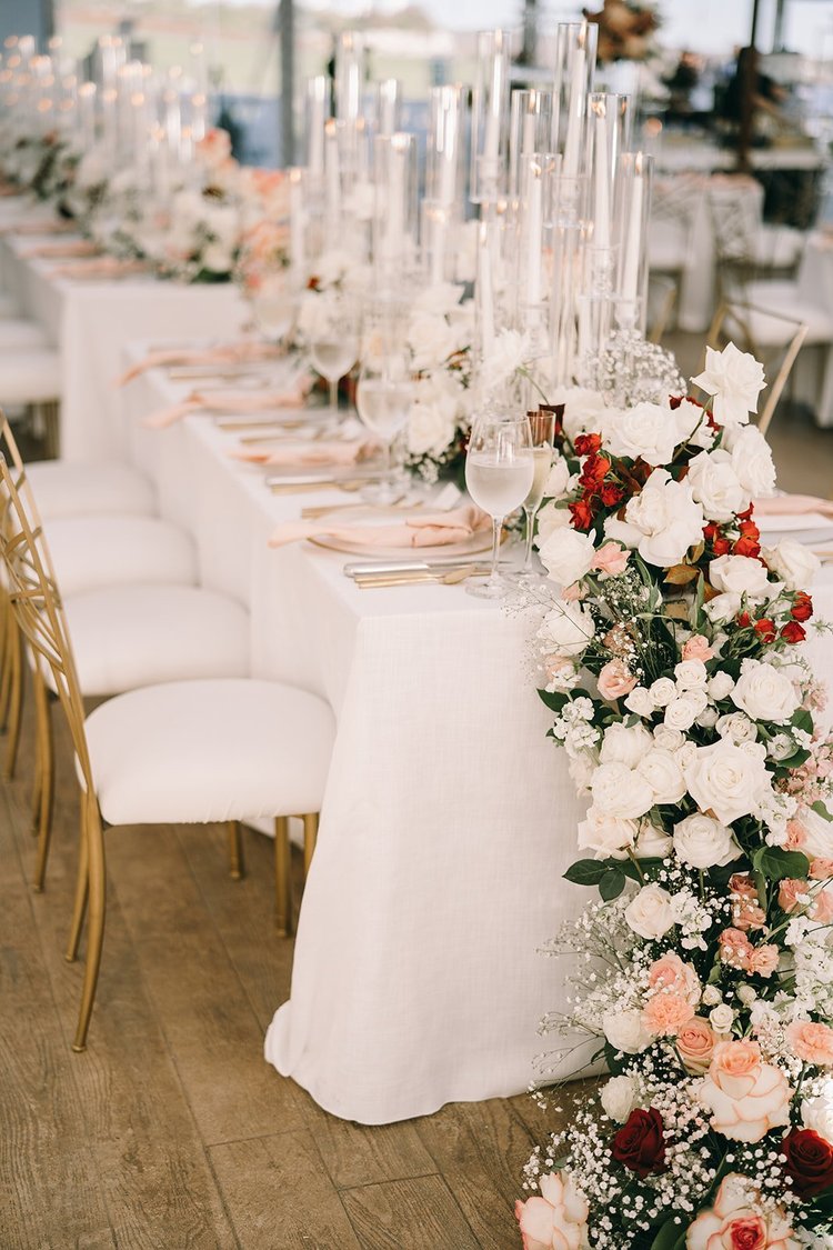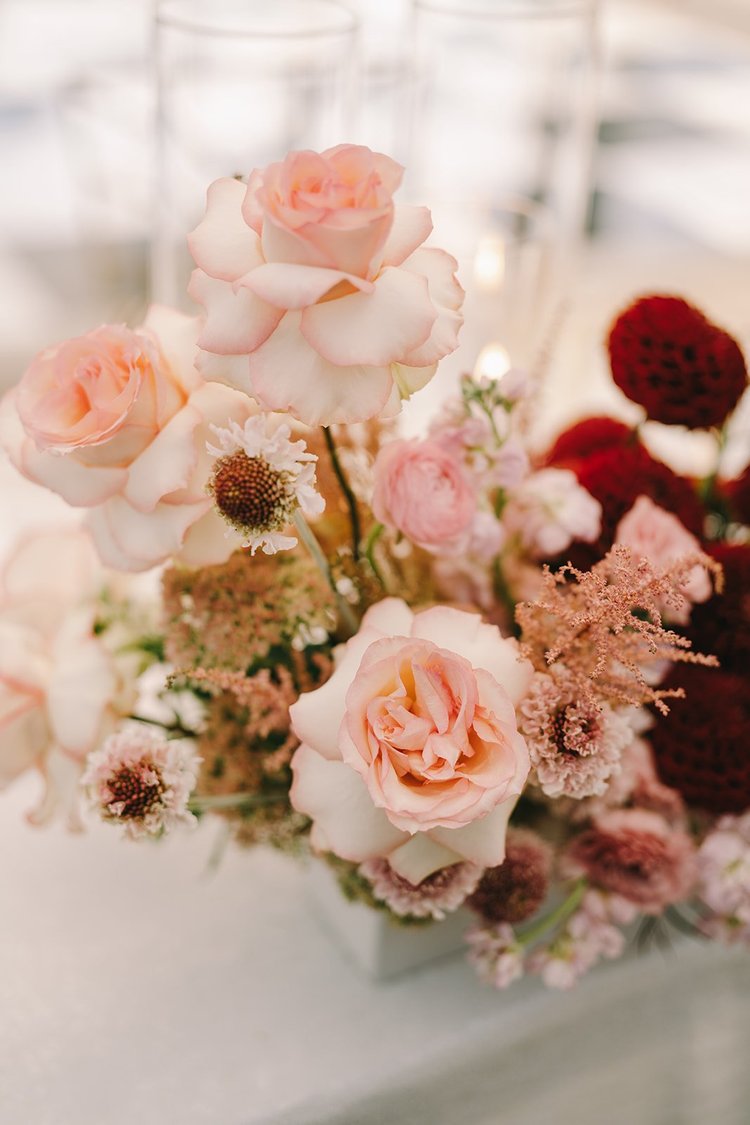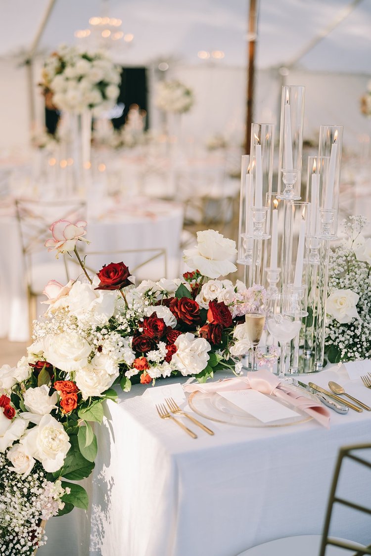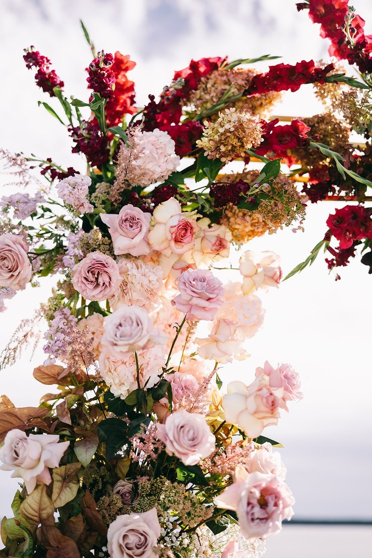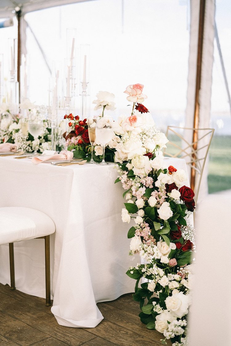 This wedding was a lovely retreat from our standard fare of loose and open seasonal flowers to the land of densely composed red roses and baby’s breath. We worked magic and shape into the arrangements and installations by type and color blocking the flowers as well as making occasional pops of dramatic dimension. Highlights of this wedding include the puppy love New Yorker couple, A Family Affair (always), that ocean (!), an unforgettable dance floor floral installation, floral garlands dripping to the floor, and all the tiny acts of kindness from the venue and everyone on the team to make this incredible work happen is such a short time period.