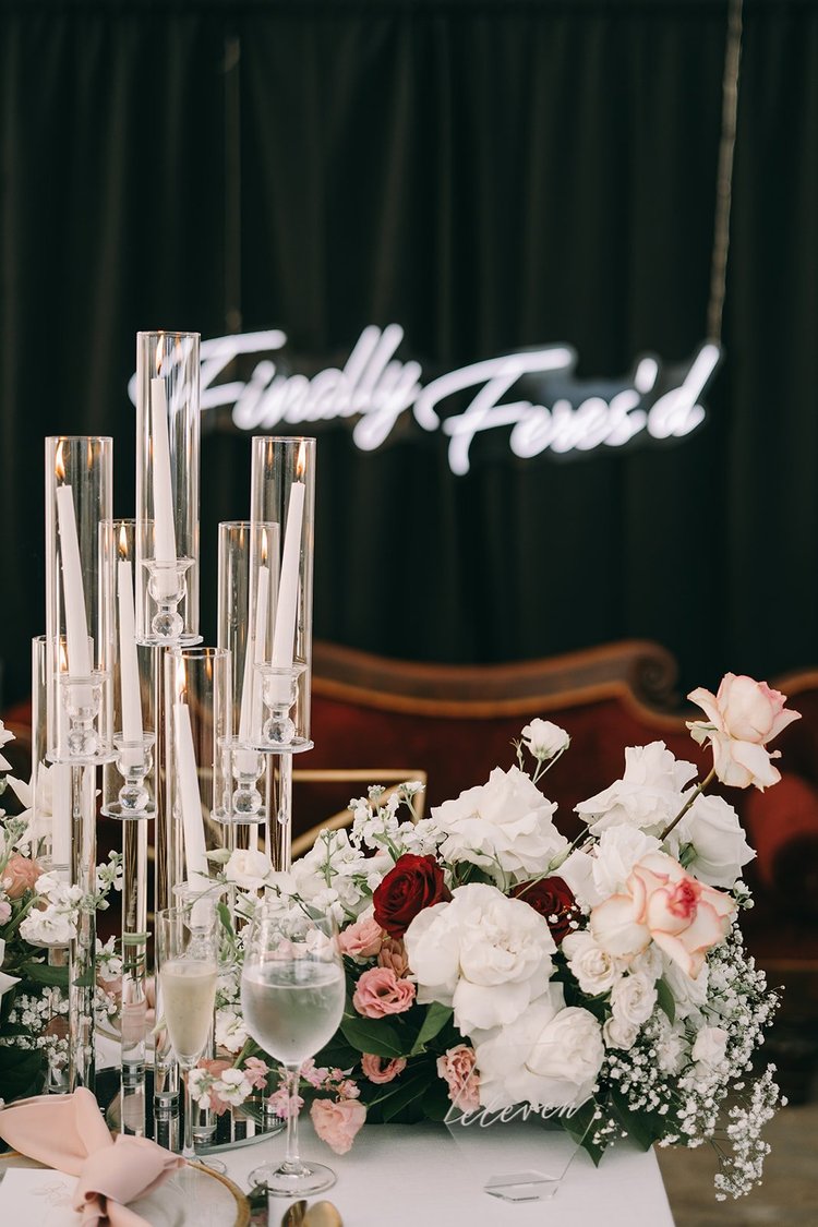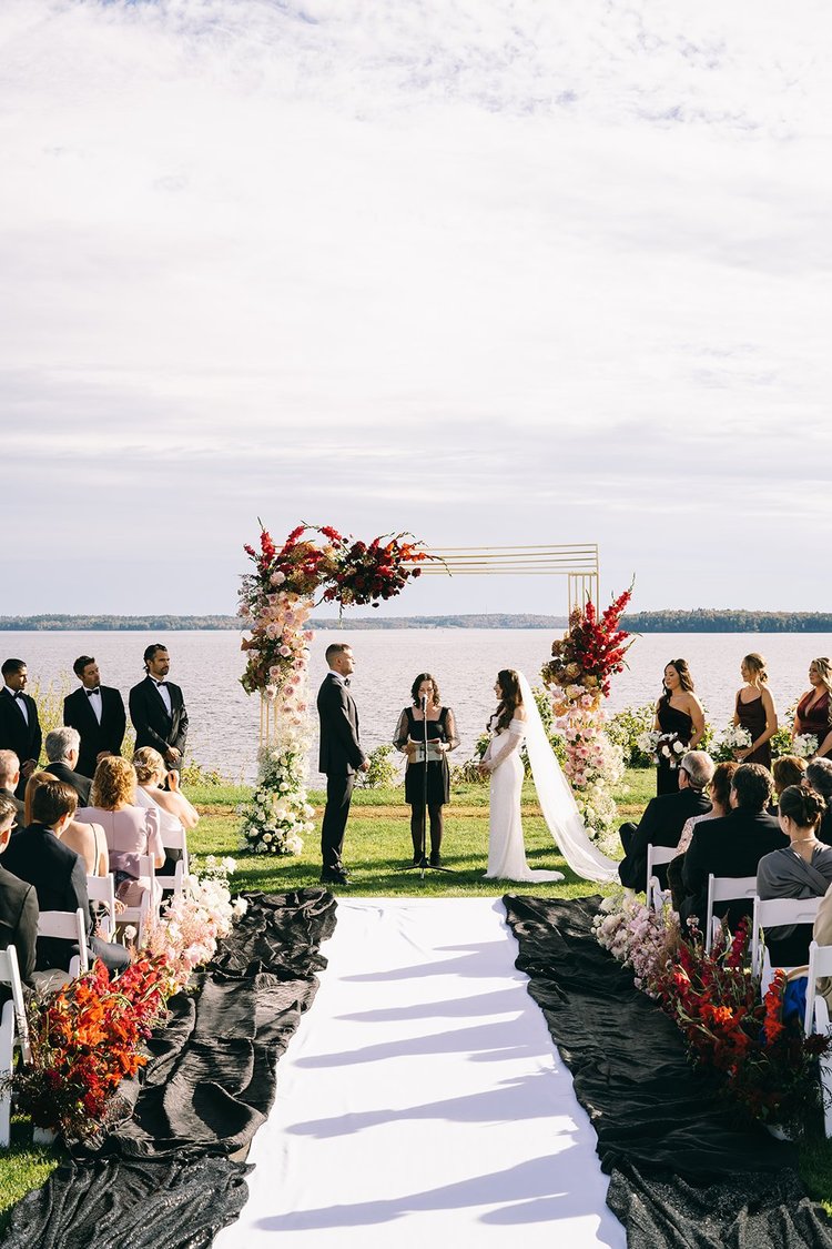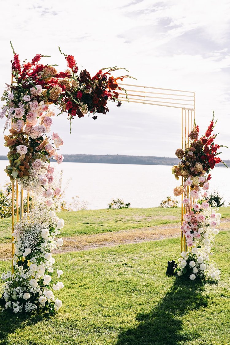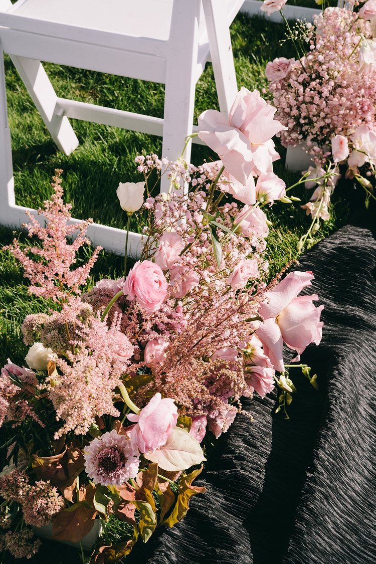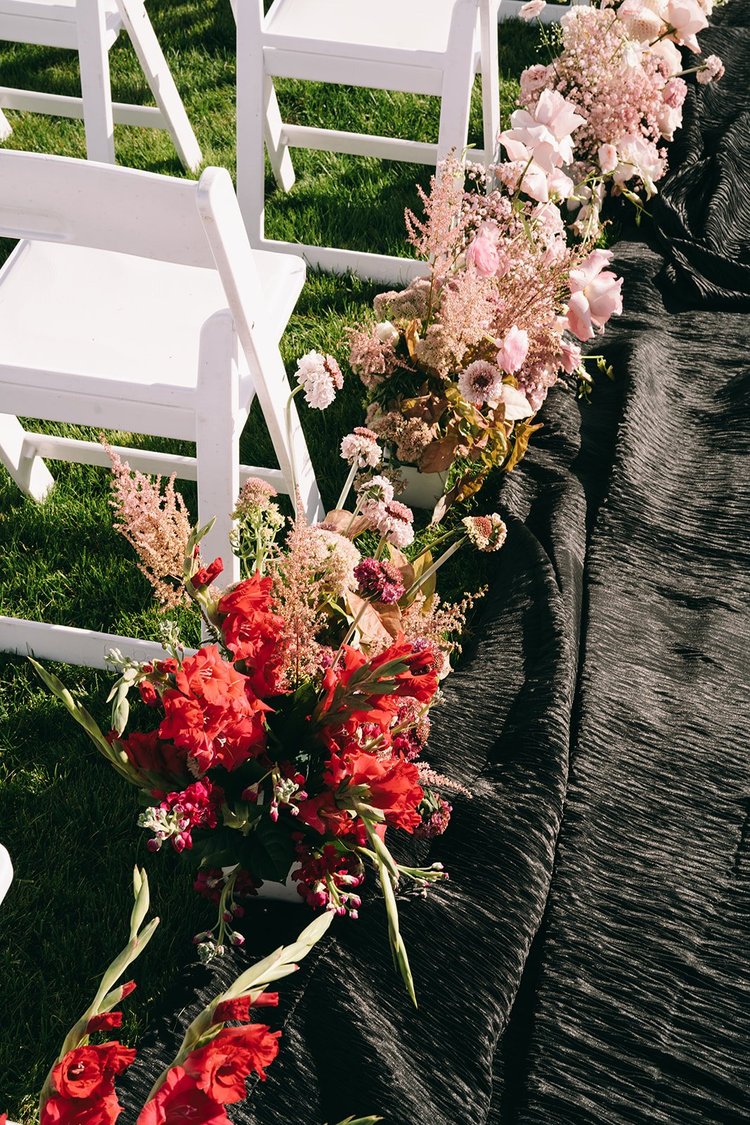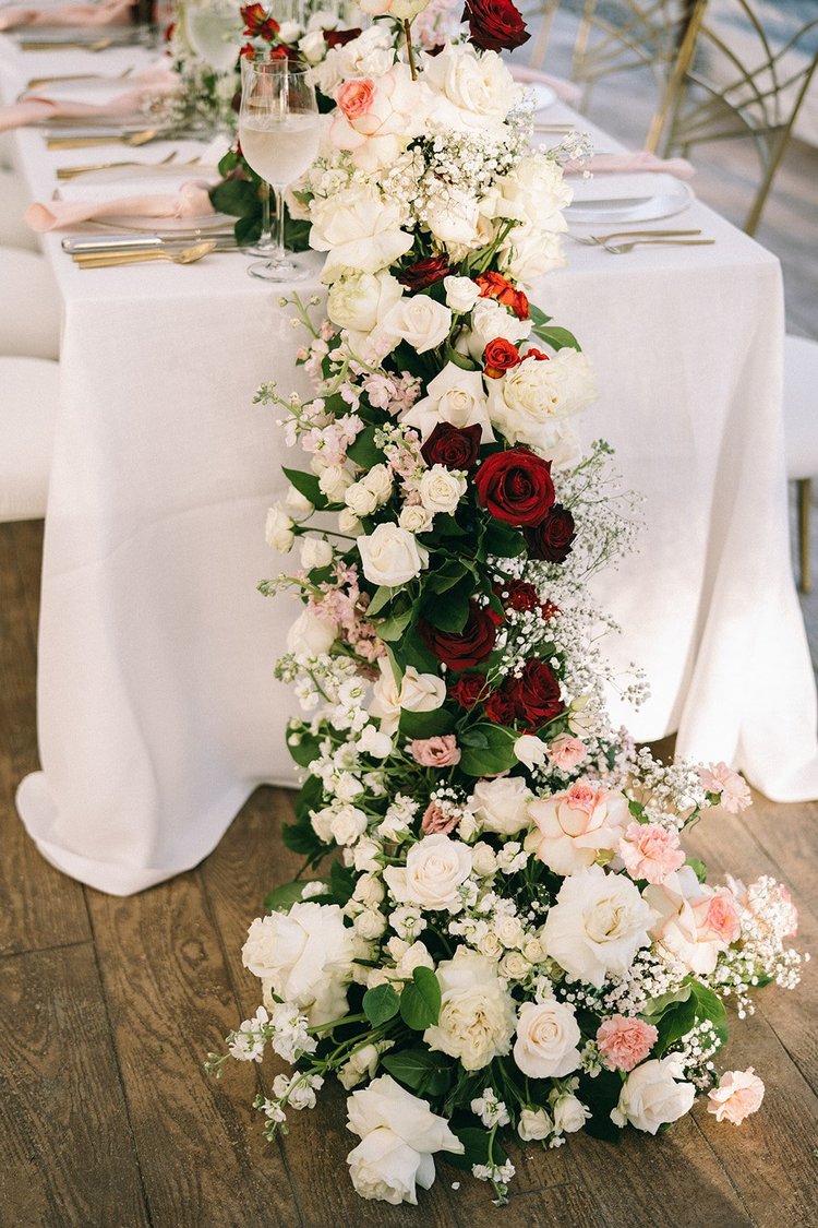 This wedding was a lovely retreat from our standard fare of loose and open seasonal flowers to the land of densely composed red roses and baby’s breath. We worked magic and shape into the arrangements and installations by type and color blocking the flowers as well as making occasional pops of dramatic dimension. Highlights of this wedding include the puppy love New Yorker couple, A Family Affair (always), that ocean (!), an unforgettable dance floor floral installation, floral garlands dripping to the floor, and all the tiny acts of kindness from the venue and everyone on the team to make this incredible work happen is such a short time period.