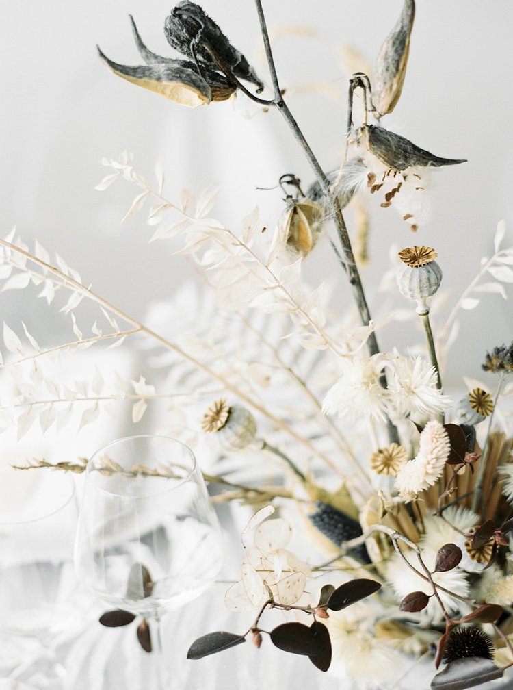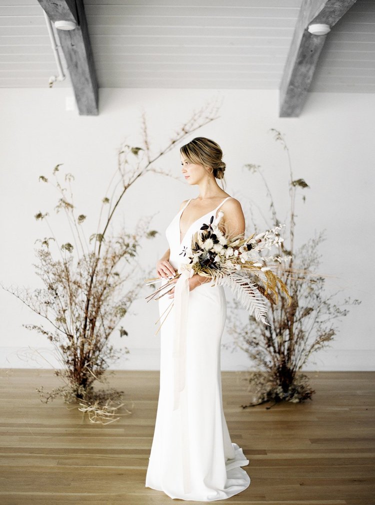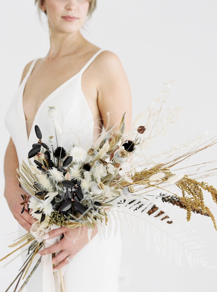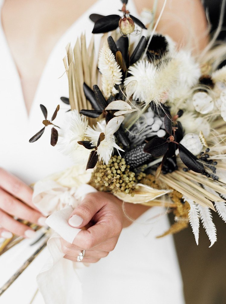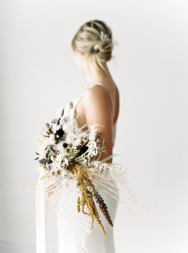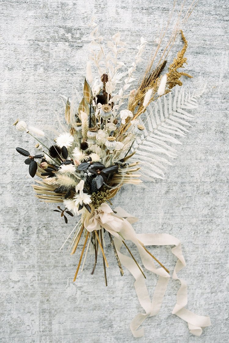 When thinking through wedding florals, we prioritize synching up the floral design to the season and location. Event flowers don't exist in a vacuum, they have to match their context and feel right where they are. In the case of this winter wedding inspiration shoot, we chose all dried flowers as that's what's real in Maine in winter; also, they're unexpected, dramatic, textured, and deeply beautiful. They worked so well because they also meshed with the location of this event. Pepperrell Cove in Kittery, Maine is a bright, clean, and modern venue that could absolutely highlight the the qualities of the materials we chose (this design wouldn't have worked in a barn, for instance, as it'd be textured brown flowers on textured brown wood) AND the material we chose highlighted the beautiful qualities of the venue. Symbiotic pairings are really the ideal in wedding design. We made the bridal bouquet in a trendy over-the-arm style so we could use longer, larger materials (dried flowers are stiff and don't drape in the way we like to make fresh ones). I also find it's a prettier, more natural way to hold a wedding bouquet. This winter wedding inspiration shoot was featured in an article about sustainable weddings in Magnolia Rouge.