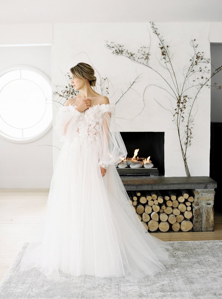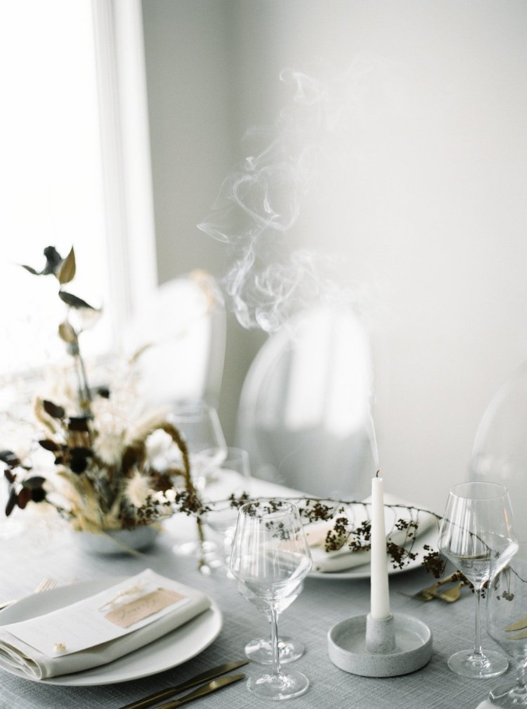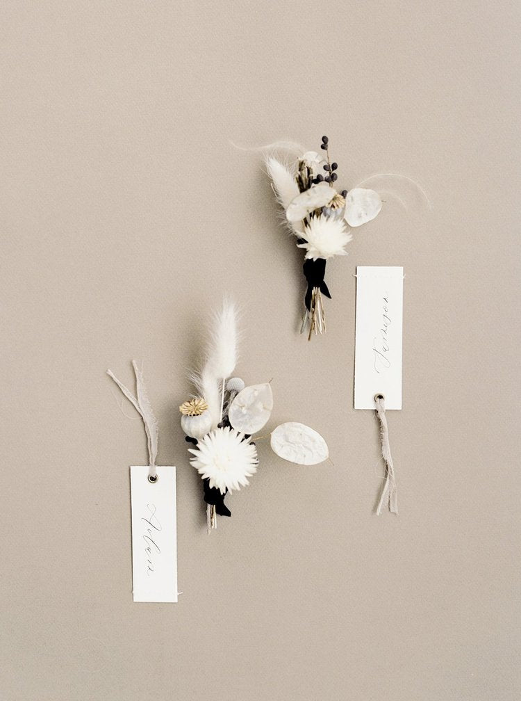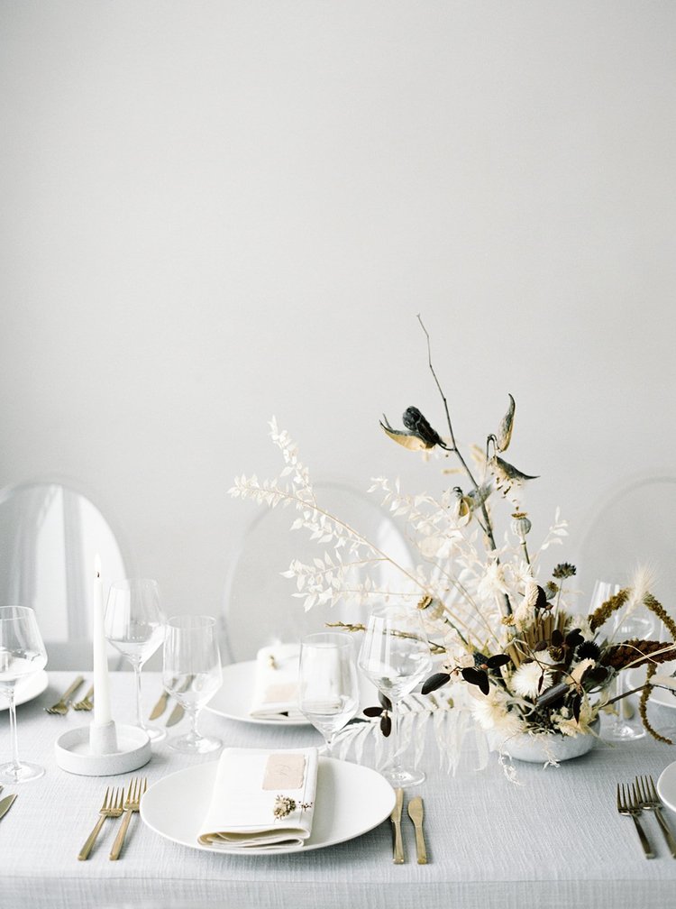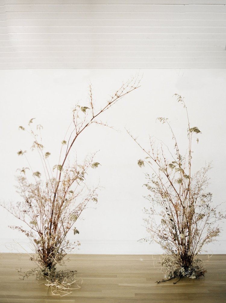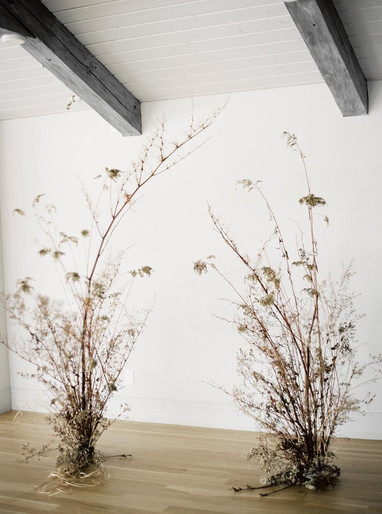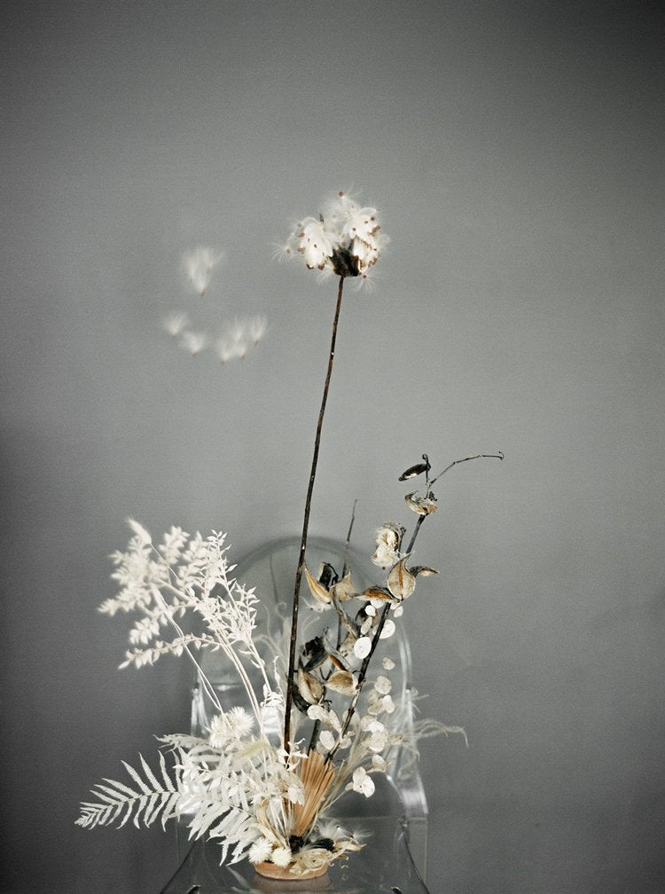When thinking through wedding florals, we prioritize synching up the floral design to the season and location. Event flowers don't exist in a vacuum, they have to match their context and feel right where they are. In the case of this winter wedding inspiration shoot, we chose all dried flowers as that's what's real in Maine in winter; also, they're unexpected, dramatic, textured, and deeply beautiful. They worked so well because they also meshed with the location of this event. Pepperrell Cove in Kittery, Maine is a bright, clean, and modern venue that could absolutely highlight the the qualities of the materials we chose (this design wouldn't have worked in a barn, for instance, as it'd be textured brown flowers on textured brown wood) AND the material we chose highlighted the beautiful qualities of the venue. Symbiotic pairings are really the ideal in wedding design. We made the bridal bouquet in a trendy over-the-arm style so we could use longer, larger materials (dried flowers are stiff and don't drape in the way we like to make fresh ones). I also find it's a prettier, more natural way to hold a wedding bouquet. This winter wedding inspiration shoot was featured in an article about sustainable weddings in Magnolia Rouge.